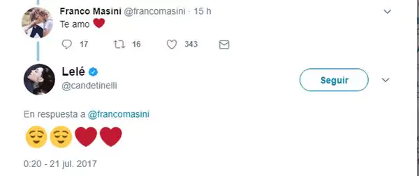 "Te amo", le escribió Franco Masini (23) a Cande Tinelli (26) a través de su cuenta de Twitter. Sin vergüenza y para celebrar su relación ante el mundo. La respuesta de ella, fue un tanto más tímida.