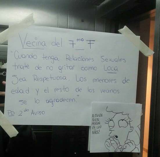 "Vecina del 7F. Cuando tenga relaciones sexuales trate de no gritar como loca, sea respetuosa. Los menores de edad y el resto de los vecino se lo agradecen", decía el cartel que un vecino colgó en el ascensor. Ya de por sí, el primer cartel era muy divertido. Sin embargo, la respuesta que alguien sumó al texto es alucinante.