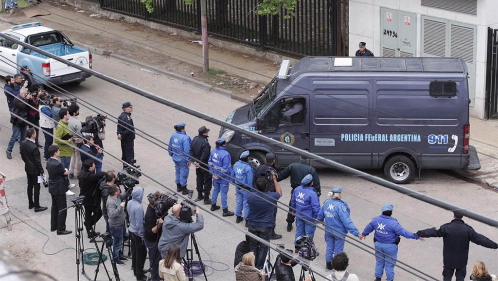El líder del gremio de la construcción a nivel local había llegado al edificio judicial esposado, con chaleco antibalas y un casco, acompañado por un grupo de gendarmes que oficiaban de custodias. Durante el arribo, la policía cortó las calles aledañas del recinto.