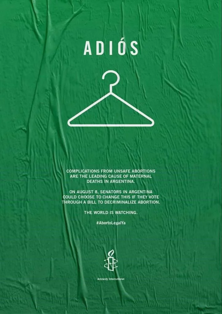 En la publicación aparece en grande la palabra "Adiós" seguido de una percha, un elemento que aún hoy se usa en algunos lugares donde el aborto es clandestino. Seguido de un texto corto que señala: "Las complicaciones derivadas de los abortos inseguros son una de las principales causas de muertes maternas en Argentina".