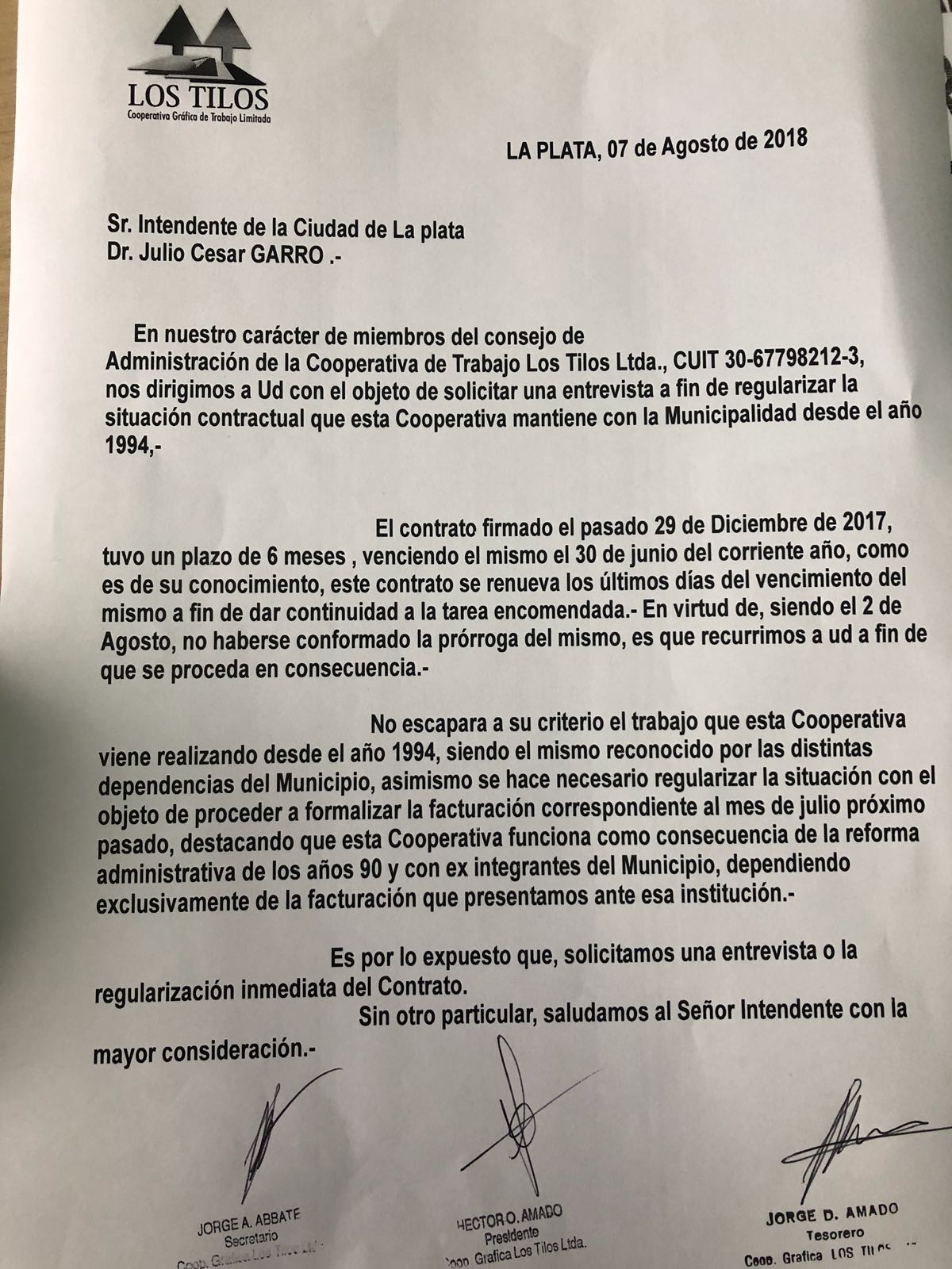 En ese sentido, también solicitaron una entrevista con el intendente Julio Garro con el objetivo de regularizar la situación contractual.