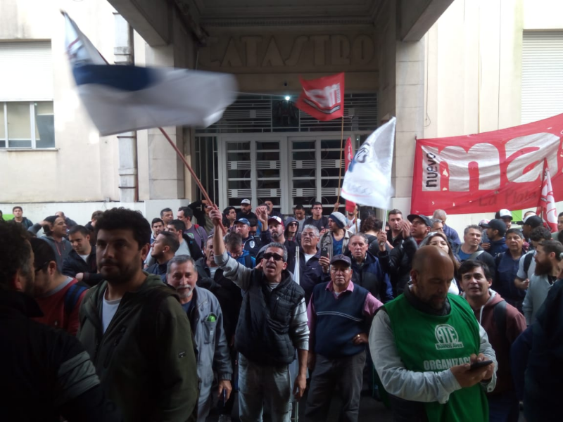 Trabajadores de Astillero Río Santiago se movilizan en el ministerio de Economía bonaerense y también en el centro platense a la espera de ser recibidos por alguna autoridad.