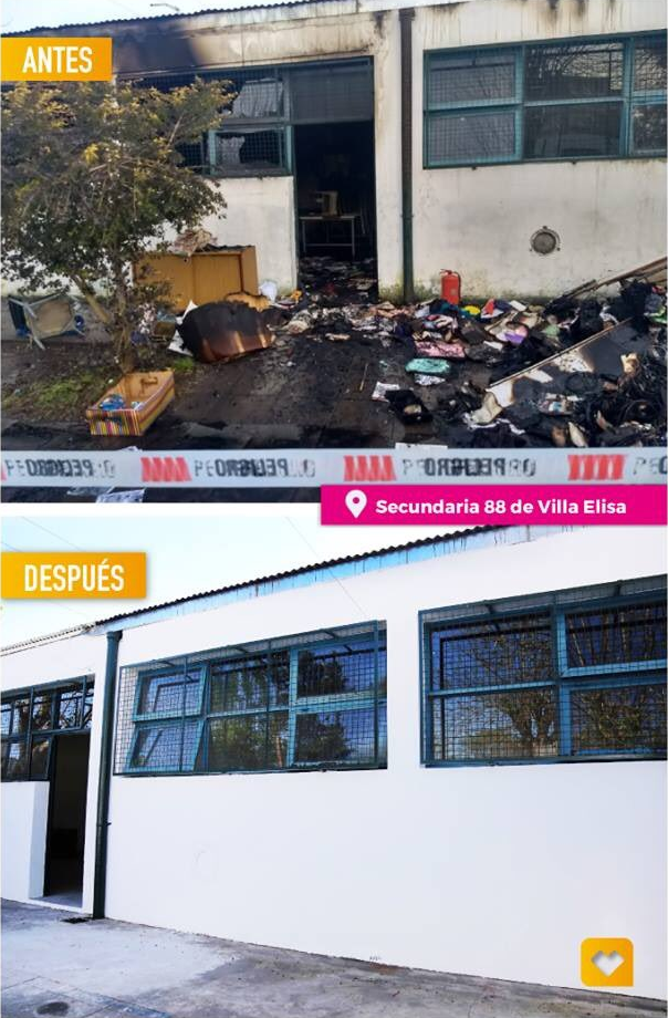 Reparamos la Secundaria N°88 de Villa Elisa que fue incendiada intencionalmente. Nuestro compromiso es hacer valer el esfuerzo que hacemos por levantar la ciudad. No podemos permitir que nadie se meta con el futuro de los chicos. Esperamos que la justicia avance. pic.twitter.com/vxYATQ7svw