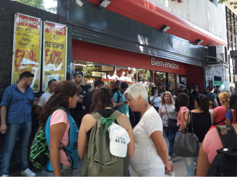 Integrantes de Barrios de Pie y Libres del Sur llevan a cabo una jornada de protesta frente a un hipermercado ubicado en 7 entre 47 y 48.