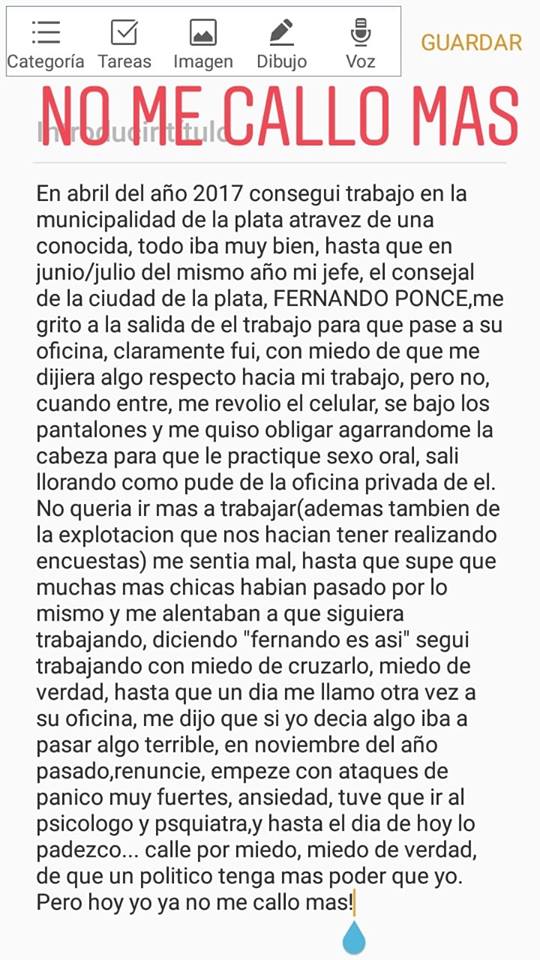 La denunciante es Annabella Beltrachini, quien trabajó con Ponce desde abril de 2017 hasta noviembre de ese mismo año. Según el relato de la joven, el viceintendente platense la invitó a su oficina, se bajó los pantalones y la quiso obligar a que le practique sexo oral.