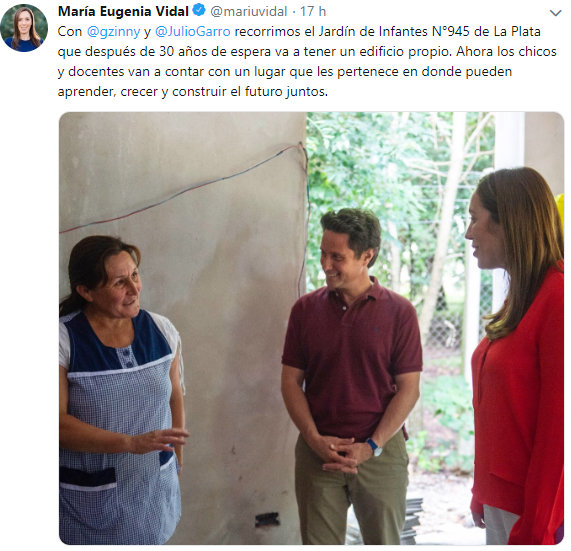 Lo llamativo es que en las redes sociales sólo lo nombra y evitó mostrarse con el intendente de la ciudad. Algunos aseguran que el supuesto 80% de imagen negativa que vendría teniendo el intendente de La Plata, según dos importantes encuestadoras tras su fracasado 2018, sería el motivo por el cual Vidal decidió no colgar una foto con Garro. Similar situación se vivió semanas atrás con el intendente de Mar del Plata en la inauguración de las playas provinciales.