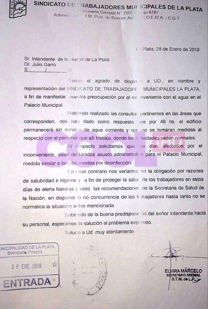 A través de un escrito en el Palacio Municipal de calle 12 entre 51 y 53, el Sindicato de Trabajadores Municipales de La Plata, le solicitó al intendente de La Plata Julio Garro que se busque una solución urgente al problema de falta de agua corriente.