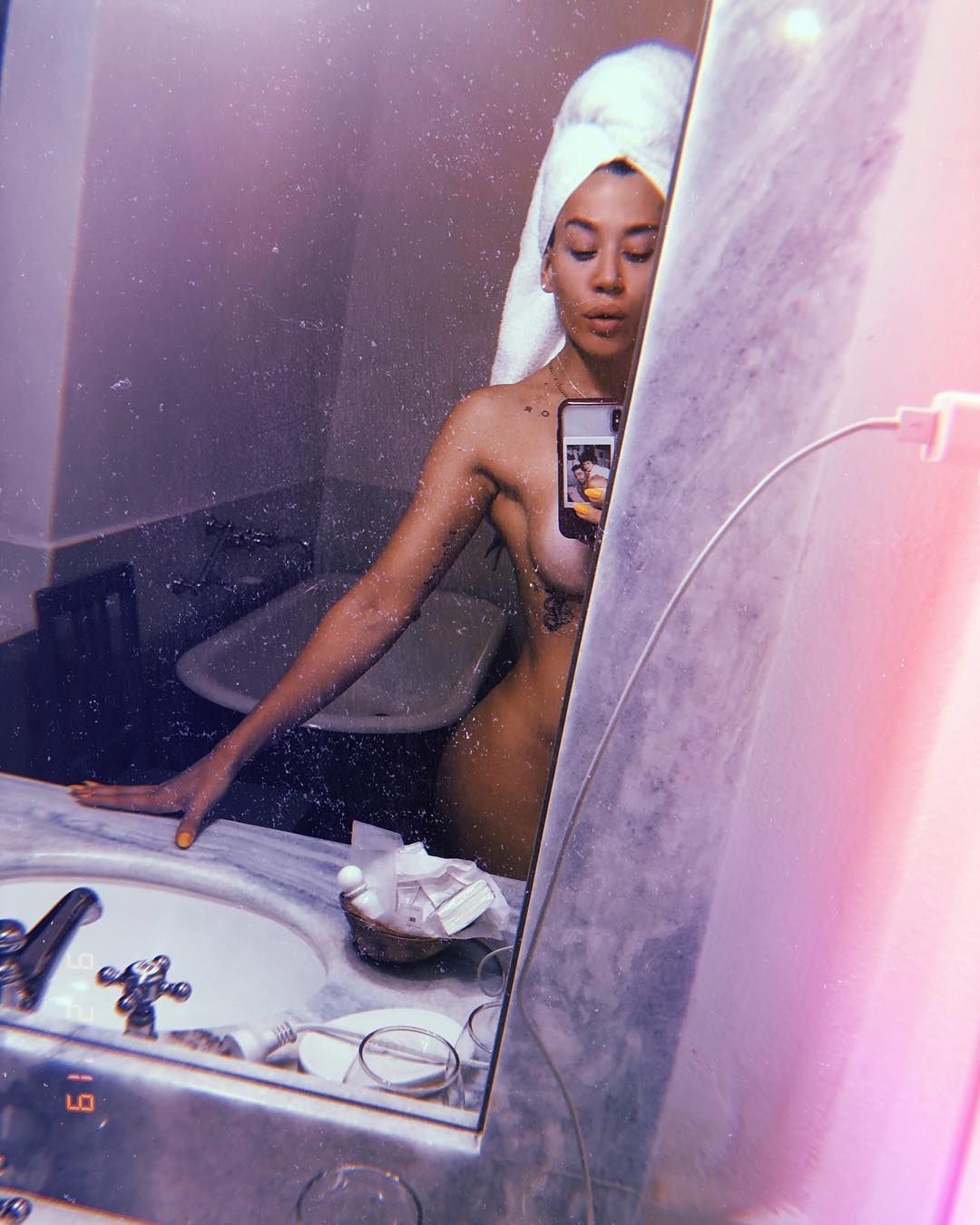 "Show time", escribió la artista junto a una caliente postal que la muestra en el baño, con una toalla en la cabeza y tapando estratégicamente sus partes más íntimas.