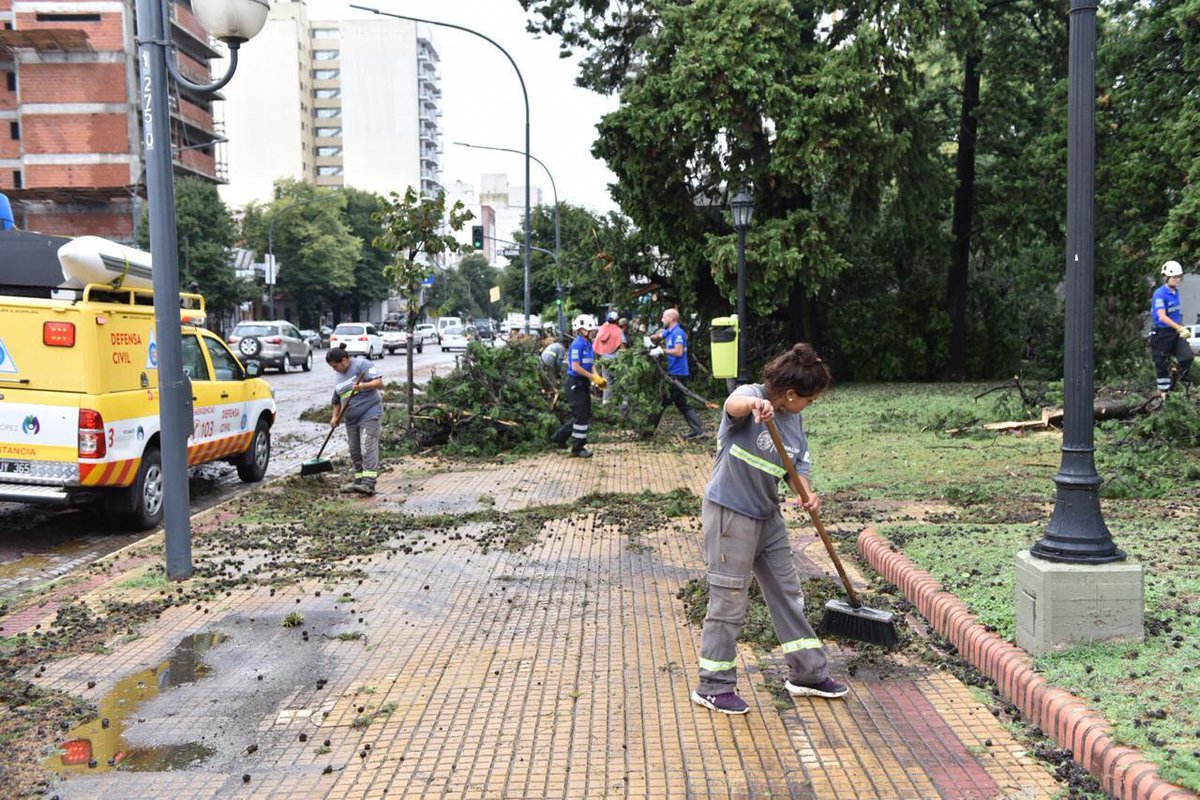 El personal de Defensa Civil y Espacio Público de la comuna trabaja en las calles para remover postes, árboles, ramas y chapas "con prioridad en aquellos ejemplares que cayeron sobre las viviendas, autos y calles, impidiendo el normal tránsito vehicular y peatonal".