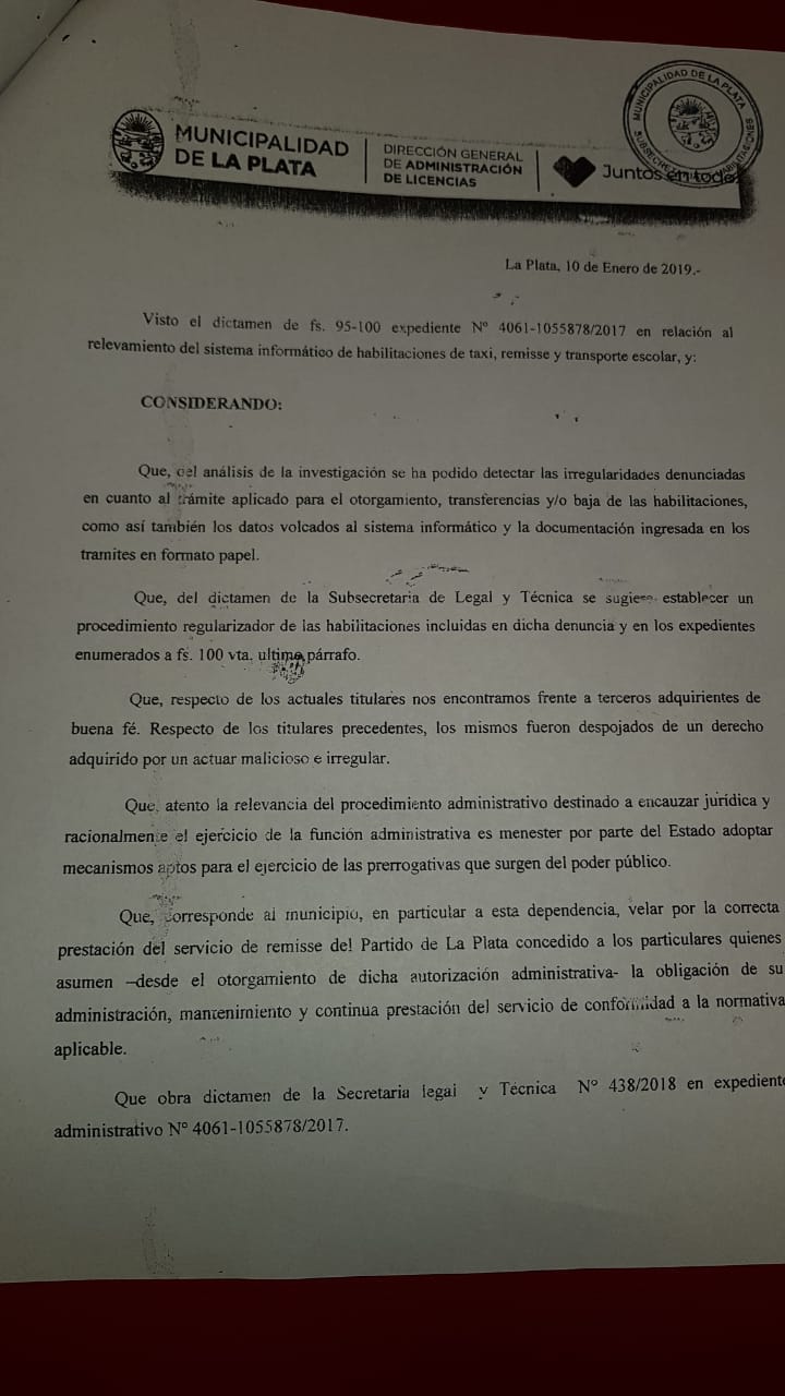 "Para realizar esta desinfección la Dirección de Habilitaciones emite un padrón de todos los vehículos en condiciones de circular como remis en el partido de La Plata, cuando consultamos ese padrón del septiembre del 2017, corroboramos que habilitaciones que estaban reclamando los titulares en el padrón figuraba otro vehículo en la misma habilitación", dice la denuncia del 2018.