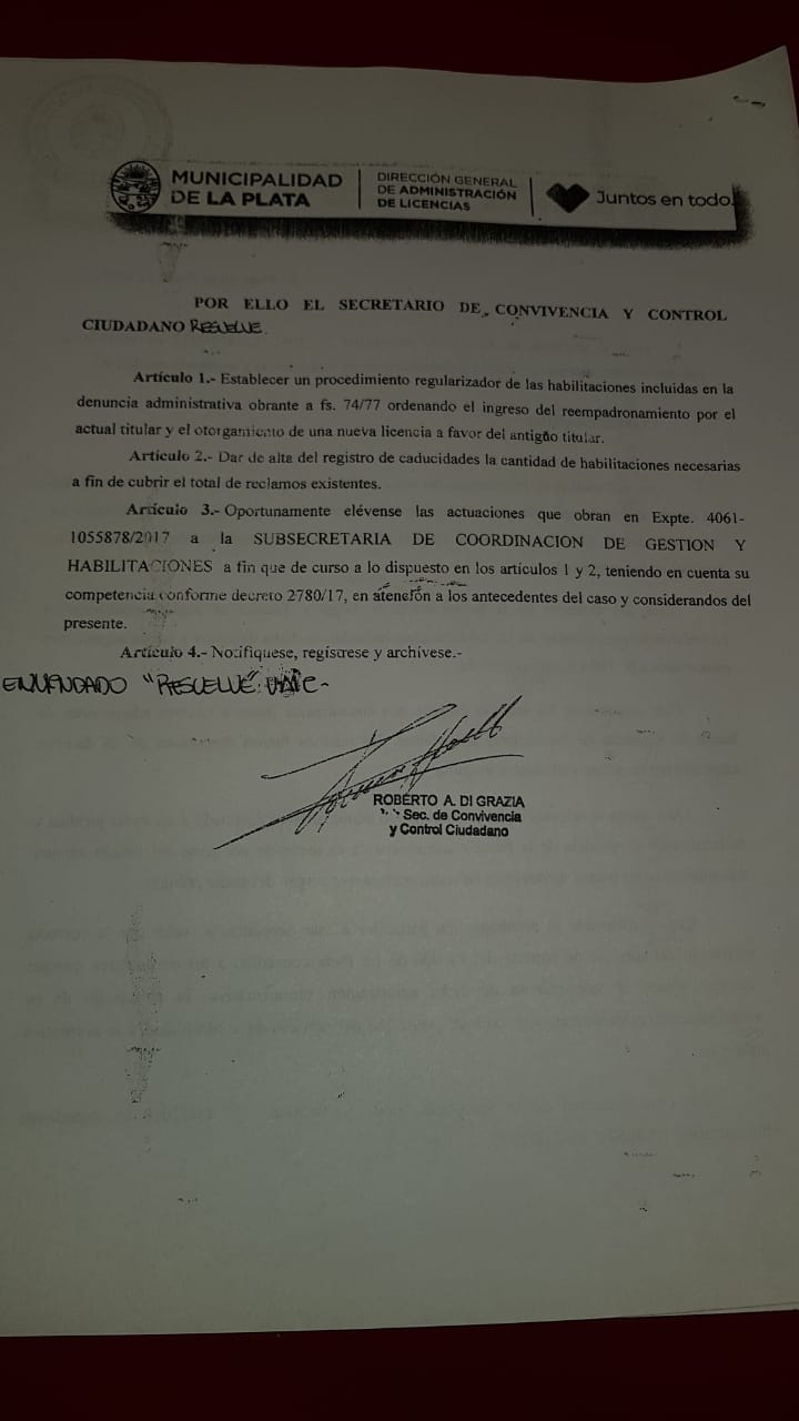 Pero aún más fuerte fue la resolución de enero de 2019 firmada por Roberto Di Grazia, secretario de Control Ciudadano, que instó a la regularización de esas habilitaciones.