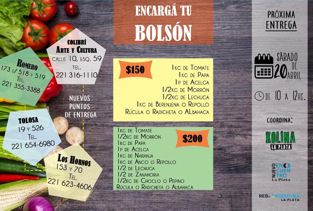 Hay dos bolsones que ya se pueden reservar. Uno de ellos cuesta 150 pesos e incluye un kilo de tomate, un kilo de papa, un paquete de acelga, medio kilo de morrón, medio kilo de lechuga, y un kilo de berenjena, repollo, recula, albahaca o radicheta.