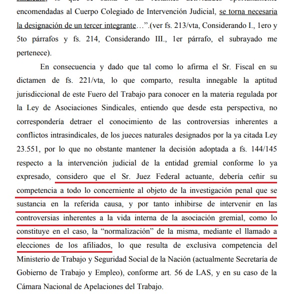 En ese sentido, agrega que Kreplak debe "inhibirse de intervenir en las controversias inherentes a la vida interna de la asociación gremial, como lo constituye en el caso, la "normalización" de la misma, mediante el llamado a elecciones de los afiliados, lo que resulta de exclusiva competencia del Ministerio de Trabajo y Seguridad Social de la Nación (actualmente Secretaría de Gobierno de Trabajo y Empleo)".