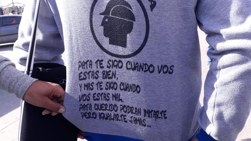 En el final del acto, el gremialista alzó un buzo del Pata Medina, el lider de UOCRA La Plata, que contiene la letra de un cántico de los trabajadores de la construcción: "Pata te sigo cuando estás bien y cuando estás mal".