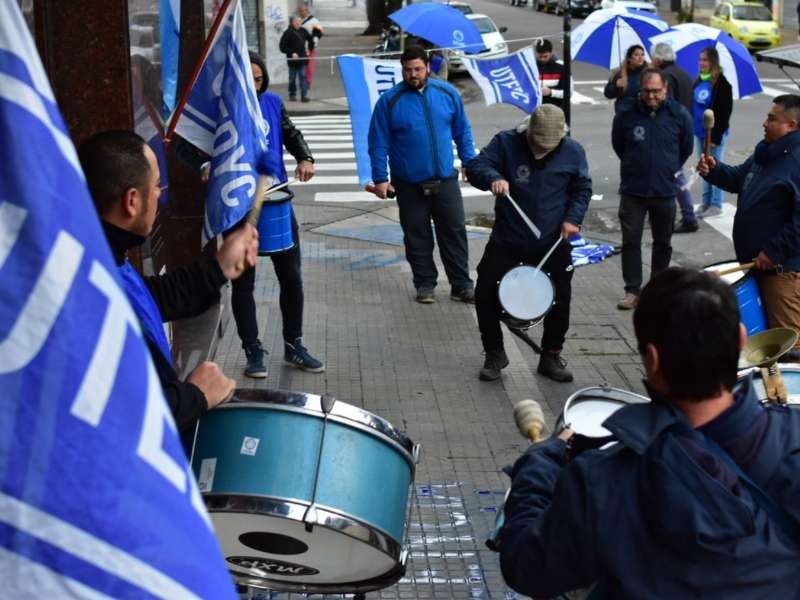 Trabajadores de la Caja de Ingenieros realizan una protesta, junto a UTEDYC, en reclamo de la reincorporación de dos trabajadores que fueron testigos de las denuncias de acoso laboral de dos compañeras.