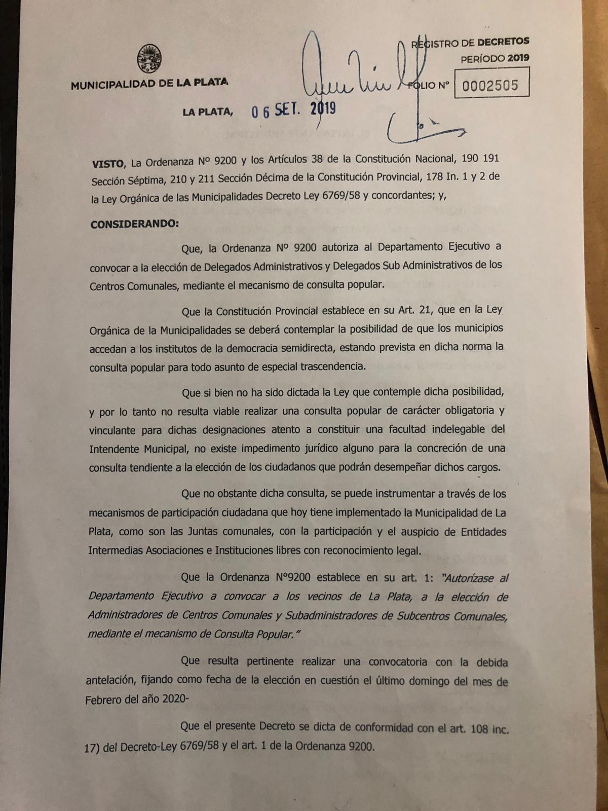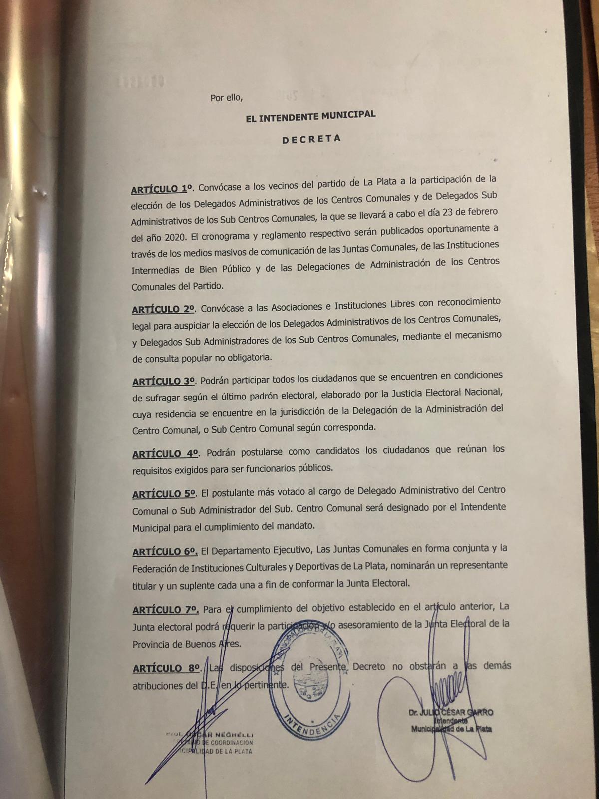 Vale destacar, que este decreto se basa pura y exclusivamente en lo que dispone la ordenanza 9200 del año 2000, que ya habilitó la elección de los administradores comunales en una oportunidad en tiempos donde el intendente de la ciudad era Julio Alak, y le brinda la oportunidad a los jefes comunales de realizar la convocatoria para que sea la población y no el Departamento Ejecutivo quien elija a los delegados.