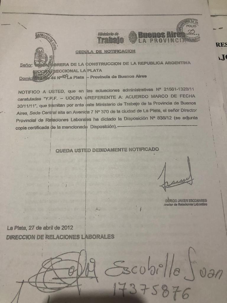 "El acuerdo trucho que tienen los interventores, está firmado y es un acuerdo por partes entre YPF, los propios interventores y aquellas empresas que cumplan funciones dentro de la fábrica. Pero lo que verdaderamente desconocen, es el verdadero reclamo que estamos ejerciendo los trabajadores, en esta medida de fuerza, y dentro de la fábrica; el reclamo que se viene arrastrando desde hace dos años hasta el día de la fecha, porque tenemos un acuerdo que rige en el Ministerio de Trabajo, que está homologado y es el legal, por eso, acá lo que nadie explica es que el trabajador tiene conocimiento, y no es ignorante, sabe que dentro del Ministerio rige un acuerdo regional".