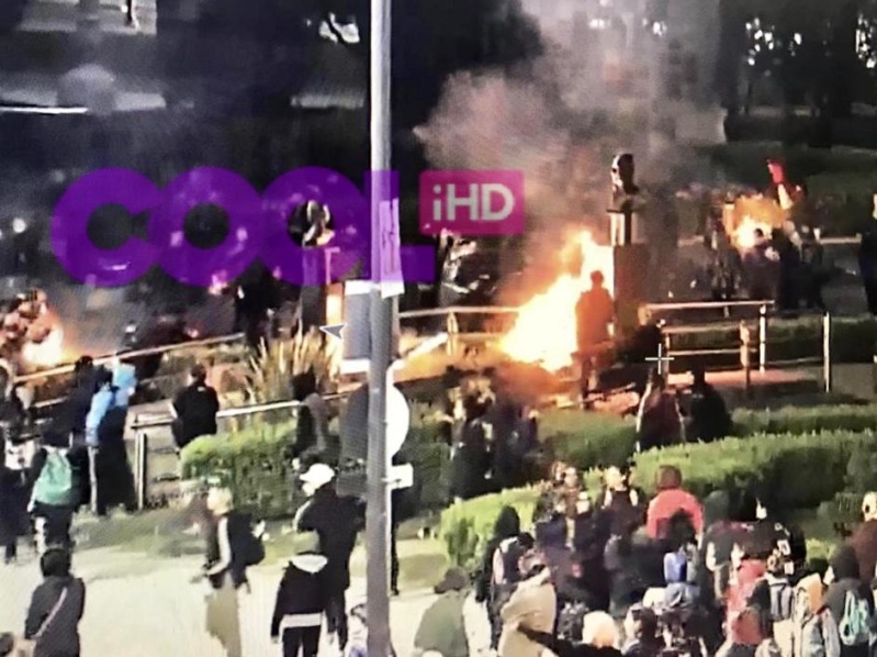 Un grupo de izquierda compuesto por personas que desconcentraban de una marcha que venía de la zona del Estadio Unico provocó graves disturbios esta medianoche en Plaza Moreno, en donde atacaron el frente de la catedral con botellas, piedras y bombas caseras y prendieron fuego en el Monumento a Eva Perón.