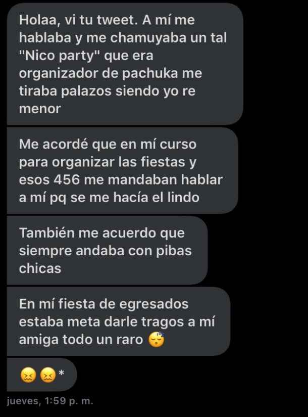 Pero las acusaciones contra Maldonado no quedaron allí. Otra chica lo identificó como 'Nico Party'. 'Me tiraba palazos siendo yo re menor. Me acordé que en mi curso para organizar las fiestas me mandaban a hablar a mí porque se me hacía el lindo. También recuerdo que siempre andaba con picas chicas', recordó.