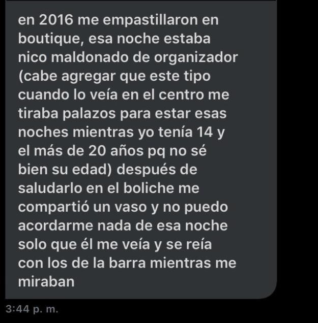 Otra agregó: 'En 2016 me empastillaron en Boutique. Esa noche estaba Nico Maldonado de organizador. Cabe agregar que este tipo cuando lo veía en el centro me tiraba palazos para estar esas noches mientras yo tenía 14 y él más de 20 años. Después de saludarlo en el boliche me compartió un vaso y no puede acordarme nada de esa noche solo que él me veía y se reía con los de la barra mientras me miraban'.