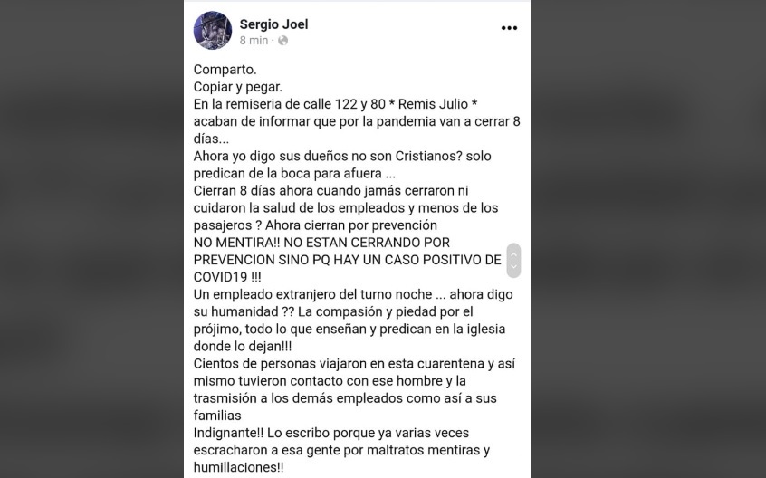 Pero otro episodio ocurrió en paralelo: una mujer denunció en su cuenta de Facebook que divulgaron incorrectamente quien era la persona infectada de la remisería.