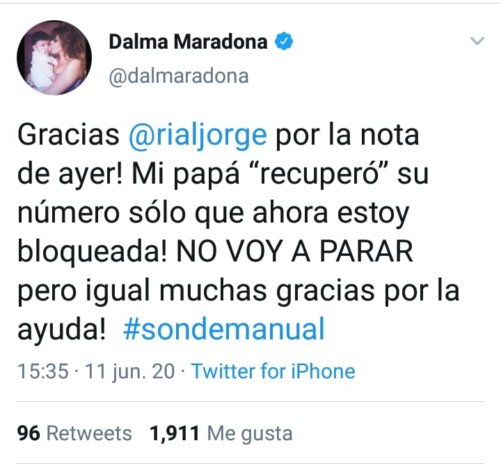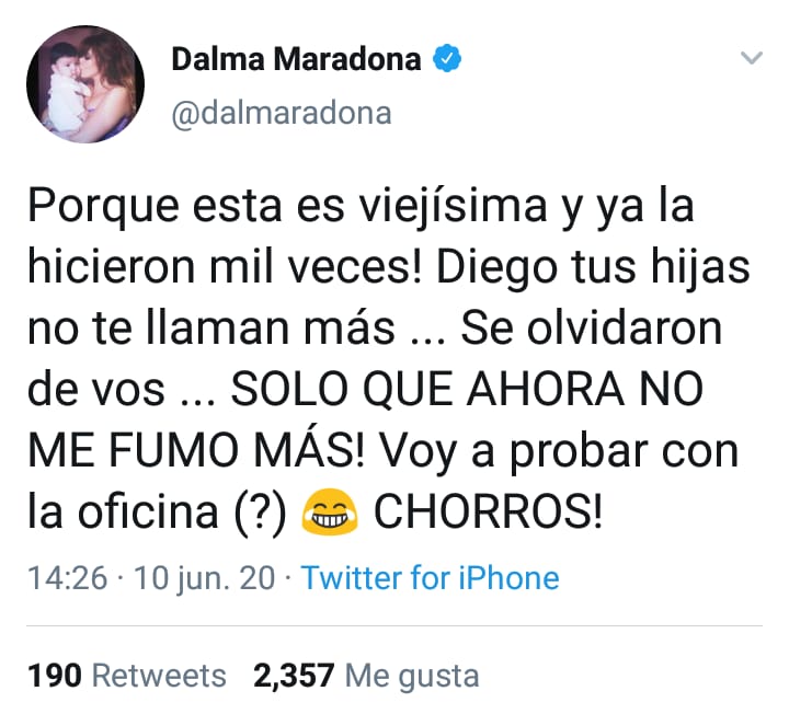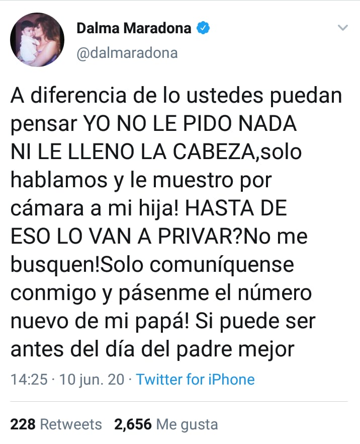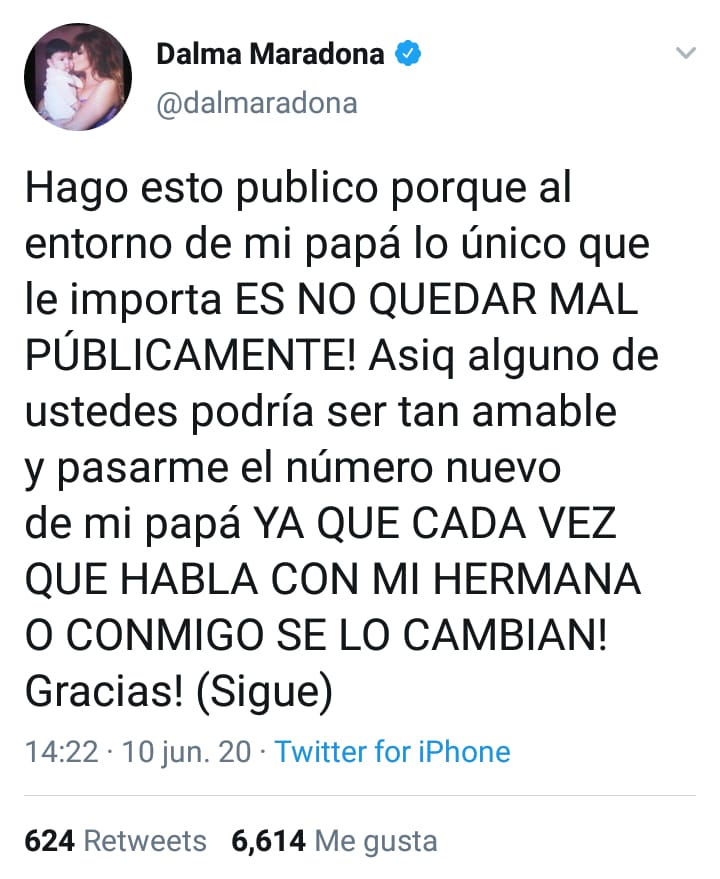 Publicó en las últimas horas cuatro tweets y arremetió contra aquellas personas que a diario conviven y están cerca de Diego. Los acusó de cambiarle continuamente el número del celular al actual entrenador de Gimnasia para que no pueda comunicarse con ellas. ´
