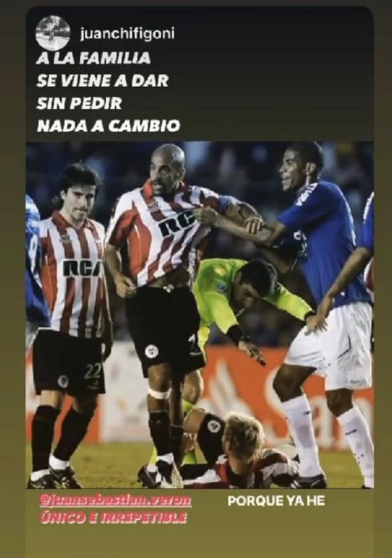 Hace minutos Sebastián Verón subió una historia a su cuenta de instagram donde lo mencionaban. El posteo original fue realizado por un hincha albirrojo que tiene una foto del partido entre Estudiantes y Cruzeiro de Brasil y donde están Braña, el propio Sebastián y Gastón Fernández en el piso forcejeando con los rivales. La imagen fue acompañada por la frase" A LA FAMILIA SE VIENE A DAR SIN PEDIR NADA A CAMBIO. Sebastián Verón UNICO E IRREPETIBLE ".