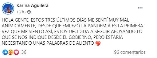 En un grupo platense de Facebook, una usuaria llamada Karina Aguilera, decidió hacer público su estado anímico de los últimos días y a los integrantes que lo conforman, les pidió palabras de aliento: "Hola gente, en estos últimos tres días me sentí muy mal anímicamente. Desde que empezó la pandemia es la primera vez que me siento así, estoy decidida a seguir apoyando lo que se nos indique desde el Gobierno pero estaría necesitando unas palabras de aliento", fue lo que escribió.