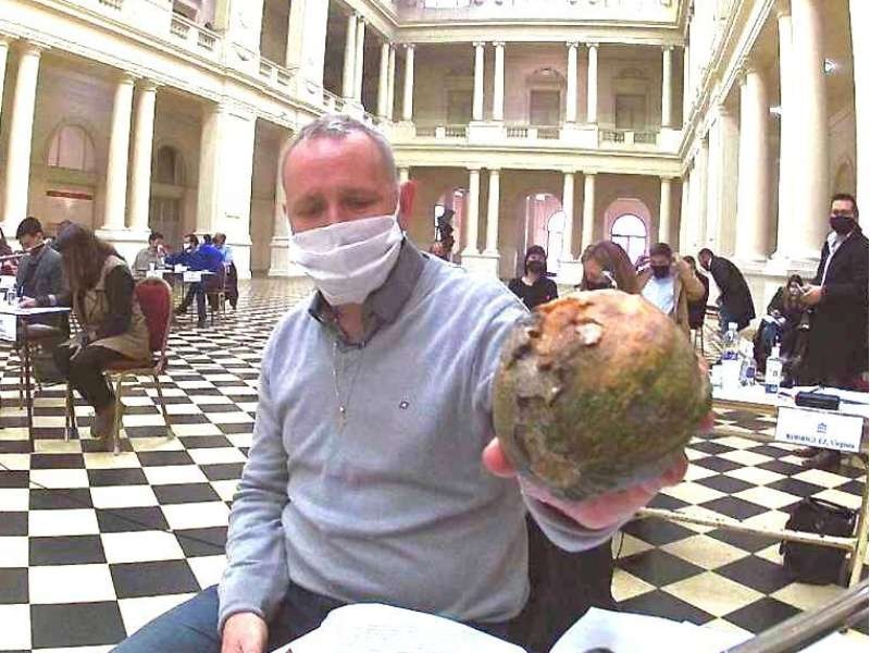 Albini retomó la palabra para dar a conocer que en una de esas bajadas de alimentos para un comedor platense, llegaron varios zapallos podridos. En ese momento, el Concejal Vander solicitó una interrupción y mostró a todos los presentes uno de los zapallos en estado de putrefacción.