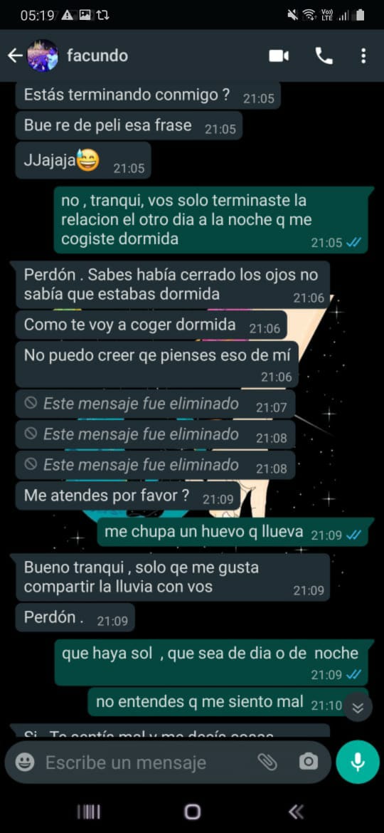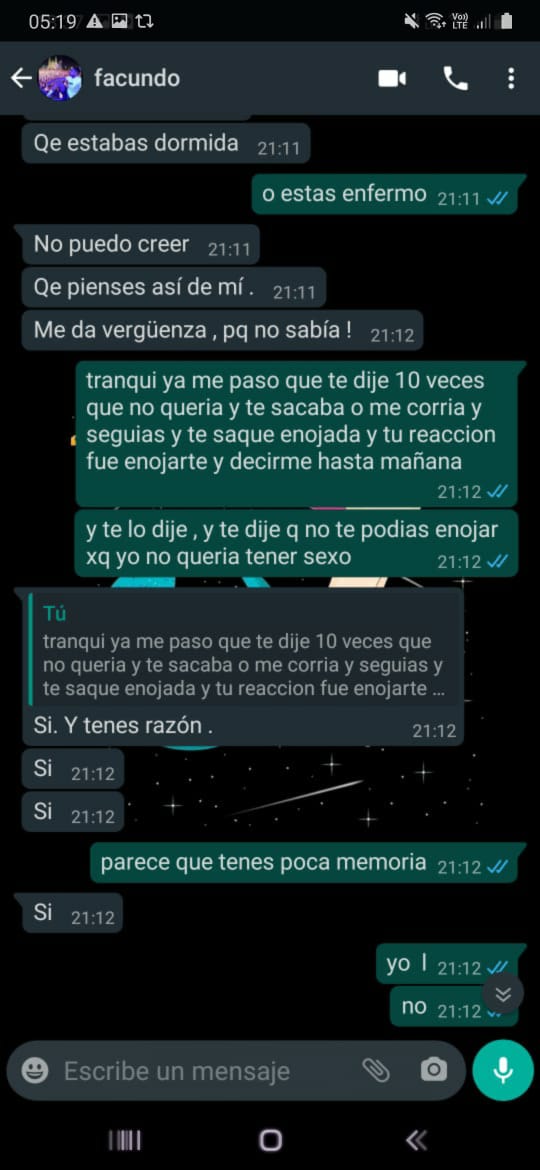 A su vez, indicó que "Creí que por querer a alguien lo podía ayudar a darle valores que sentí que le faltaban, pero también sabía que sola no podía porque había algo más fuerte, ya que se enojaba fácil y rompía cosas de él o mías y se pegaba; yo lloraba y trataba de agarrar sus manos para que no se pegue, pero sentía que no podía con esa situación. Me pedía perdón por lastimarme, pero no quería cambiar. Hablé con su familia y me dijeron que cuando era chico, fue a médicos pero abandonó los tratamientos".