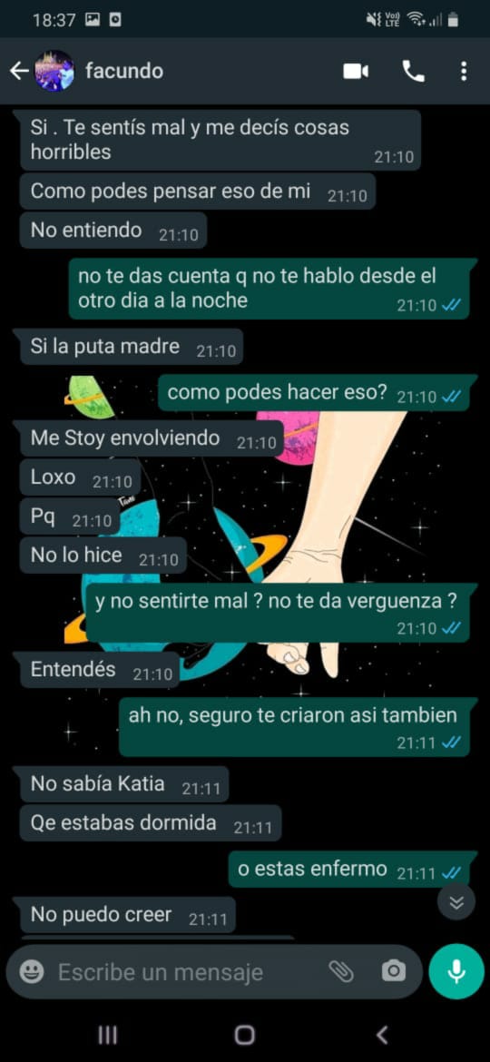 En ese sentido, Katia puntualizó que "hoy me tocó a mí, pero mañana le puede pasar a otra mujer. Me quise ir de su casa en buenos términos y solo por ponerme a guardar mis cosas, me ahorcó y me agarró de los pelos desde la puerta de su casa hasta tirarme en la cama; me escondió las llaves para que no me fuera, rompía cosas contra la pared o el piso, se pegaba piñas en la cabeza y eso no es normal. Hoy me pude escapar, con hematomas y lesiones en la cara y el cuerpo, y la ayuda de 4 patrulleros y mi viejo, pero quizás más tarde no llegaba a pedir ayuda".