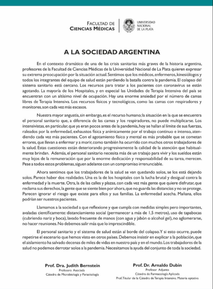 "Profesores de la Facultad de Ciencias Médicas de la UNLP quieren expresar su extrema preocupación por la situación actual. Sentimos que los médicos, enfermeros, kinesiólogos y todos los integrantes del eqiopo de salud están perdiendo la batalla contra la pandemia. El colapso del sistema sanitario está siendo cercano", comienza diciendo la publicación.