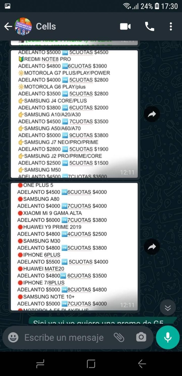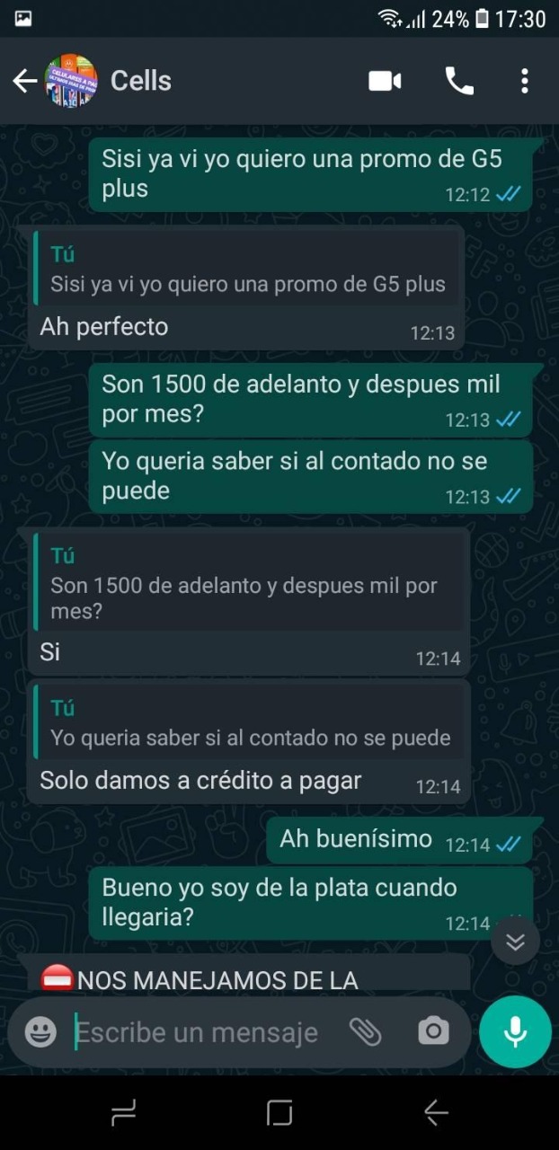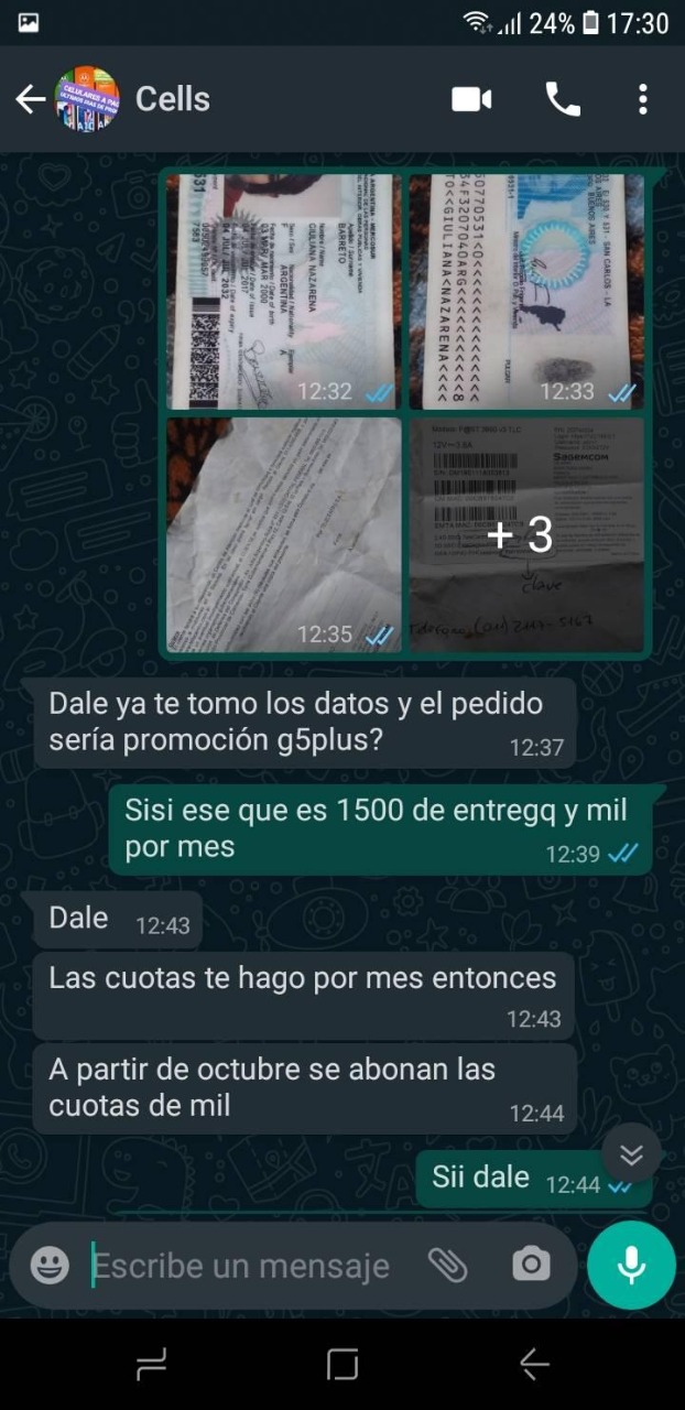La víctima se llama Nazarena Giuli. En su cuenta de Facebook publicó lo que le sucedió. Quiso comprar un celular modelo G5 Plus y según los chats que publicó con la vendedora, debió darle un adelanto de $1.500 pero el equipo nunca le llegó.