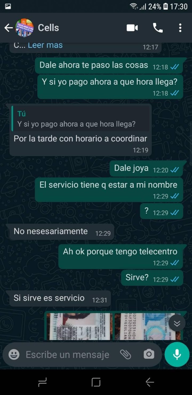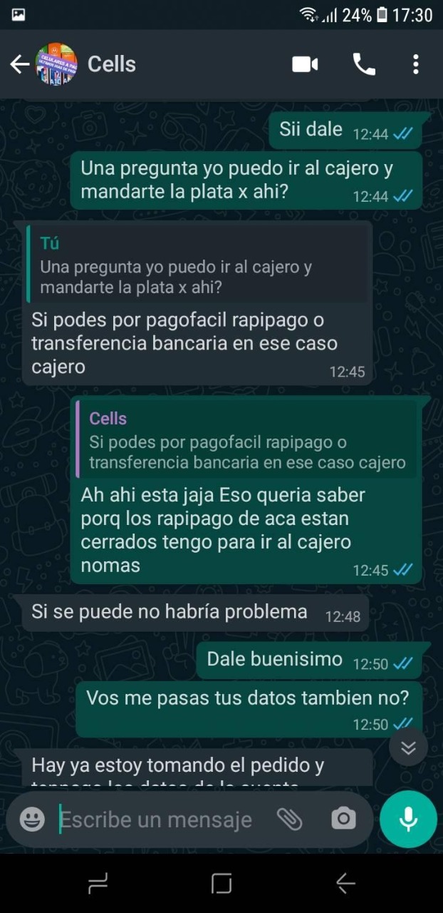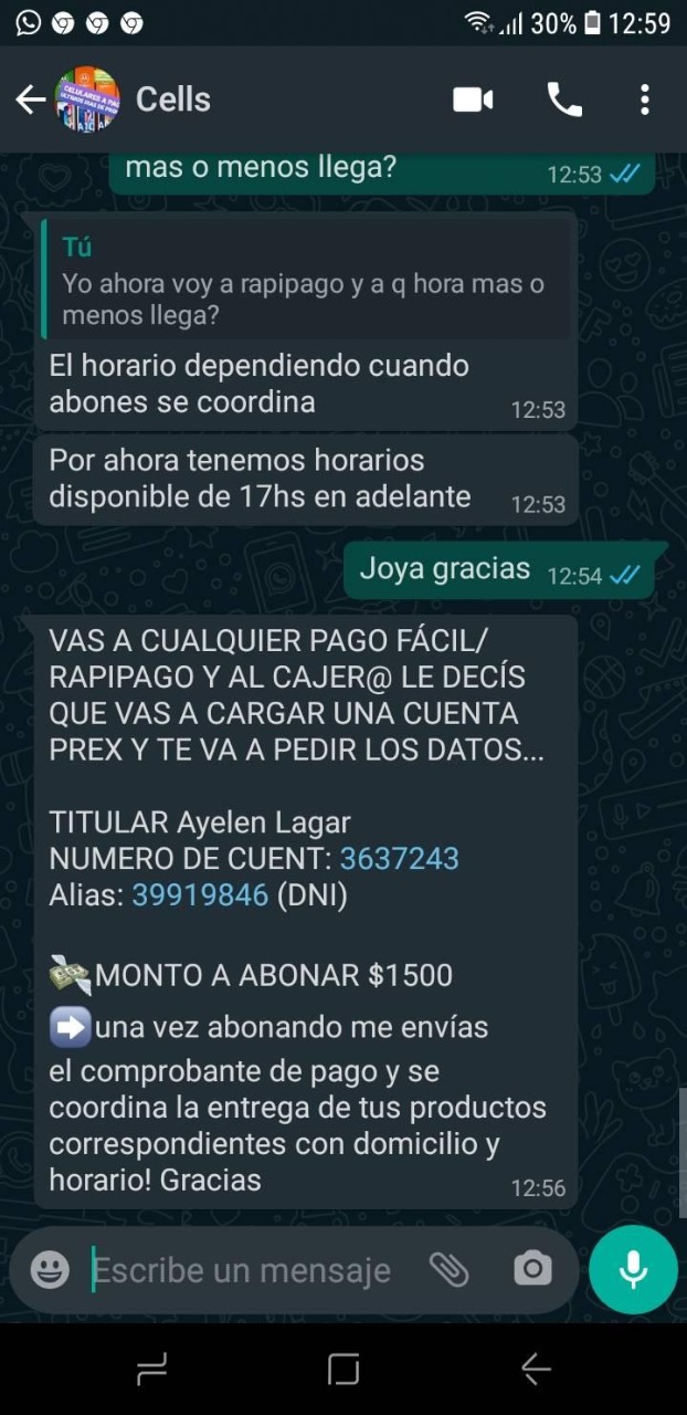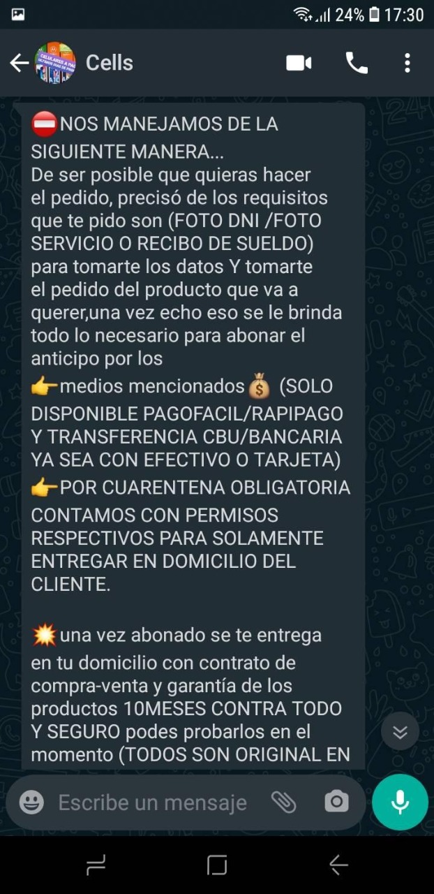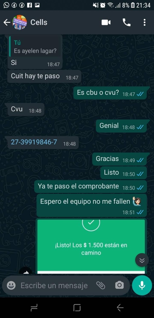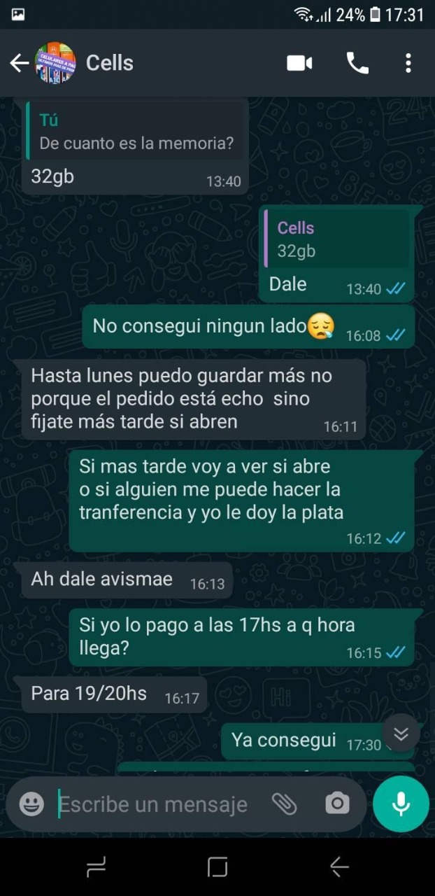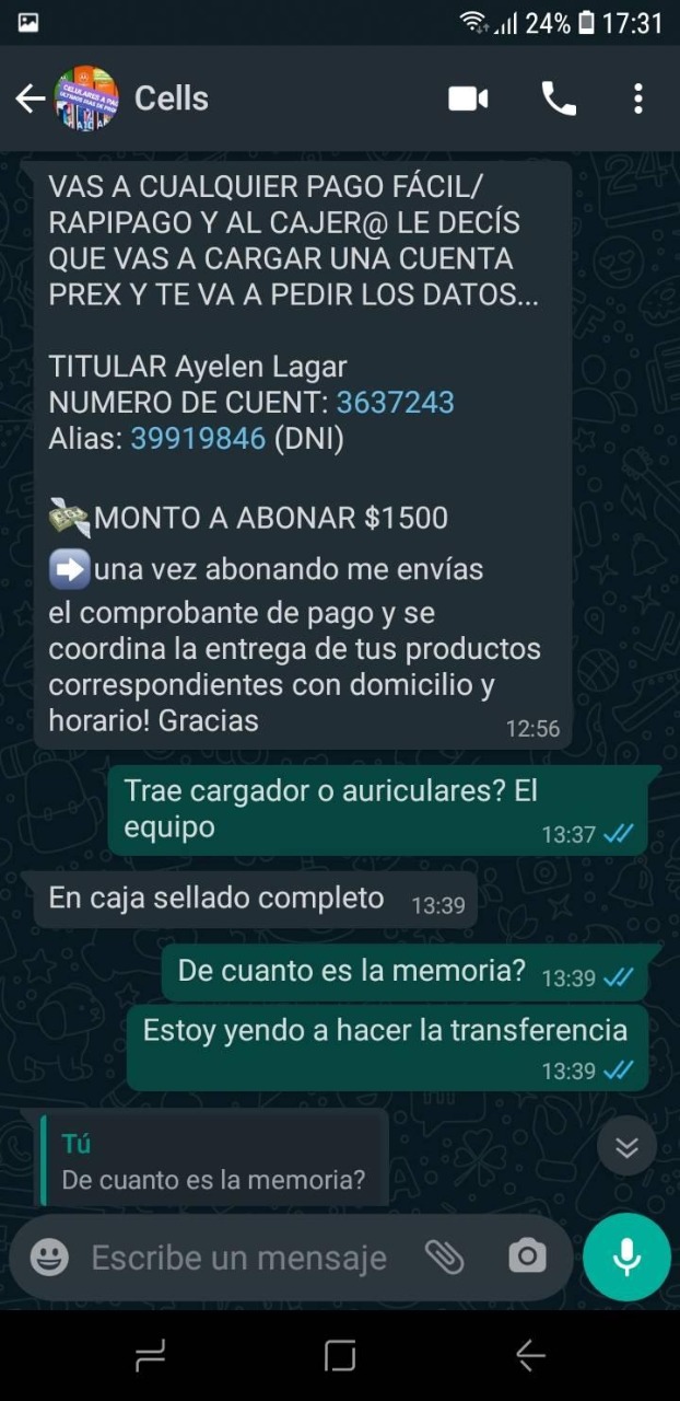 Lo cierto es que según mostró Nazarena, una vez que realizó el pago y avisó que lo había hecho, la persona encargada de entregárselo, la bloqueó del celular y le ponía distintas excusas en cuanto al atraso en la entrega del celular.