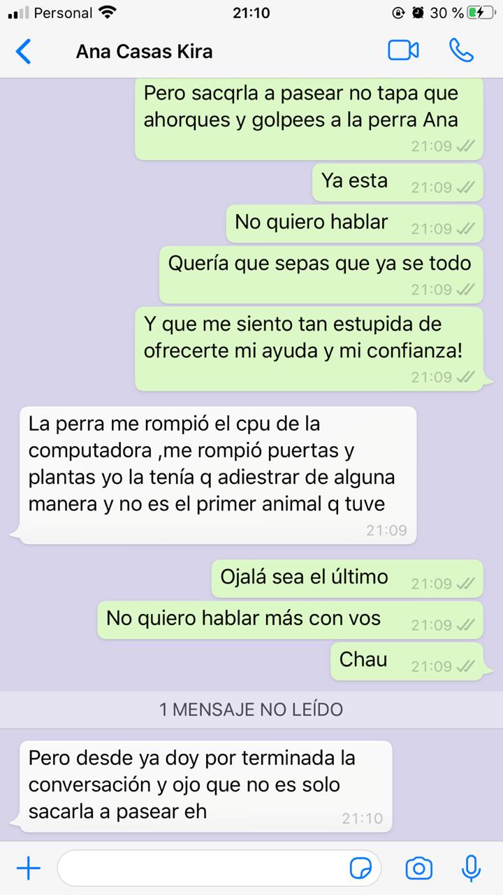 "Los primeros días todo venía genial, nos enviaba fotos de ella paseando a Kira, de Kira en la plaza, de Kira en la cama... hasta que un día dejo de responder nuestros mensajes, y después de varios días de esperar su respuesta una de mis compañeras la llamó por teléfono. Esto último la sacó de quicio, se transformó automáticamente en una persona maleducada y comenzó a insultar a mi compañera diciéndole que no le rompa las pelotas (palabras textuales), que la perra era suya y que ella no debía rendirle cuentas a nadie y mucho menos a nosotras, que ella a su perra la tenía bien y que no le escriba mas porque la iba a bloquear", relató Aldana.