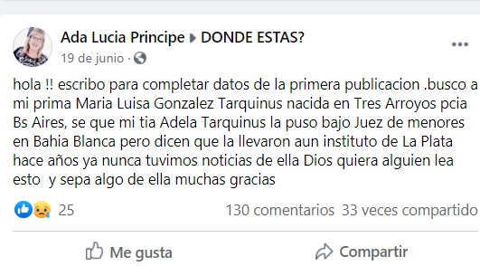 "Sé que mi tía Adela Tarquinus la puso bajo Juez de Menores en Bahía Blanca, pero dicen que la llevaron a un instituto de La Plata hace años ya nunca tuvimos noticias de ella. Dios quiera alguien lea esto y sepa algo de ella, muchas gracias", precisó Ada Luz.