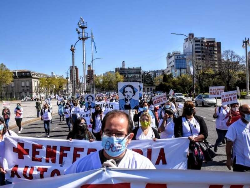 La movilización de los enfermeros comenzó en 51 y 16 y se trasladó hasta la Casa de Gobierno, donde cientos de trabajadores del sistema sanitario de La Plata y la provincia reclamaron por mejores condiciones laborales.