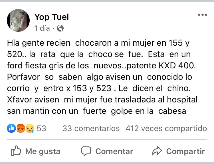 En su cuenta de Facebook (Yop Tuel) el joven denunció cómo sucedió: "Recién chocaron a mi mujer en 155 y 520. La rata que la chocó se fue, está en un Ford Fiesta gris de los nuevos. Por favor si saben de algo avisen. Un conocido lo corrió y entró por 153 y 523. Le dicen "el chino". Por favor avisen, mi mujer fue trasladada al Hospital San Martín con un fuerte golpe en la cabeza".