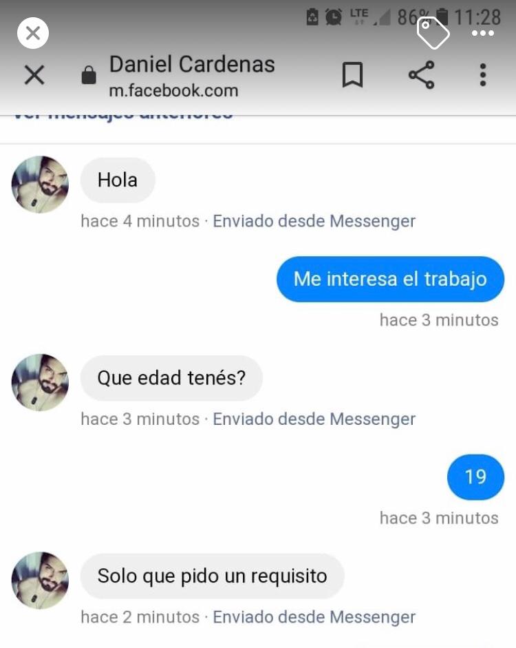 Luego de esta situación, la joven decidió exponer el chat y agregó: "Tengan cuidado con ese tipo Daniel Cárdenas, porque te dice para trabajar y te pide este requisito. Cualquiera... me da tanta bronca... uno buscando trabajo y están los pervertidos. Ayúdenme a denunciarlo por favor".