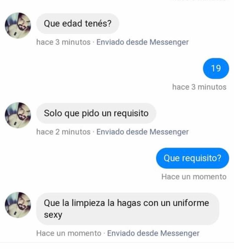 El sujeto en cuestión se llama Daniel Cárdenas y según los mensajes que ella publicó en las redes sociales, cuando se contactó con el hombre, le pidió un sola condición para contratarla: "Solo te pido un requisito, que la limpieza la agas con uniforme sexy".
