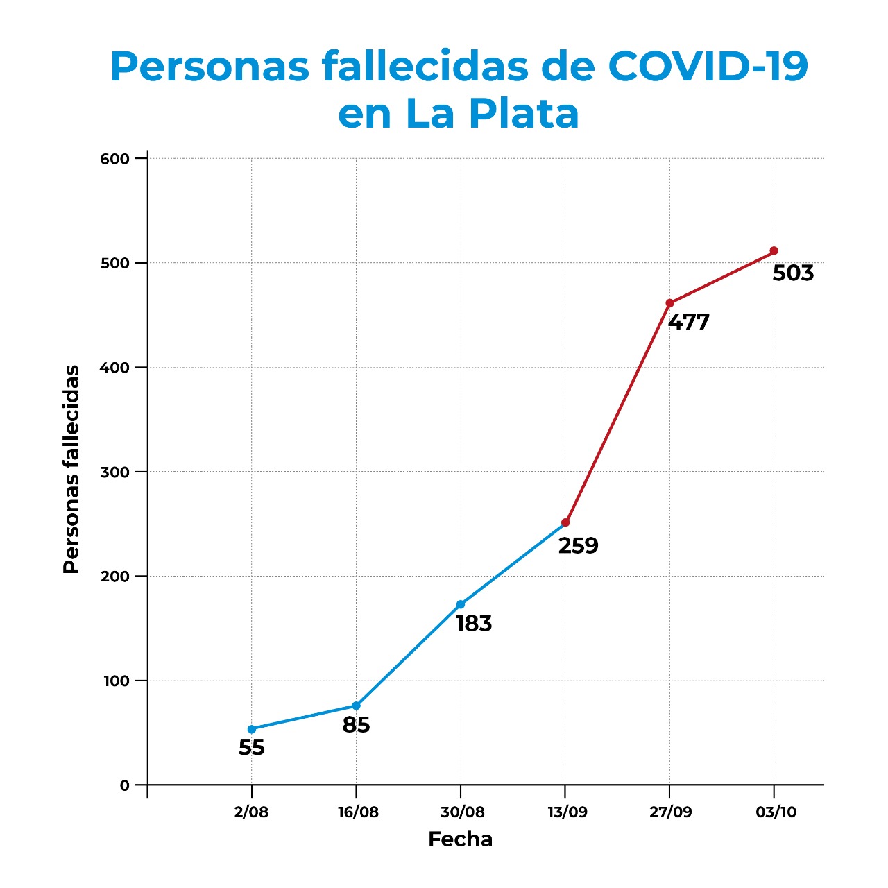 Por su parte, la cartera de salud provincial busca perfeccionar incansablemente las herramientas para combatir el alcance del virus. Asimismo, basándonos en datos recolectados del Ministerio de Salud de la Nación y otros organismos competentes, se pudo extraer que en La Plata los casos siguen en aumento y en las semanas del 30 de agosto al 27 de septiembre hubo 294 muertos, lo que representa un 61,63% en este mes; y en la quincena del 13 al 27 de septiembre se reconocieron 218 muertos, que equivalen a un 45,7% del total hasta la fecha destacada: 475. El día 3 de octubre el número de fallecidos alcanza los 503 y actualiza las cifras a un 58,45% en el mes y 43,34% en la quincena. Es necesario poner en valor que cada cifra no solo representa el dolor de la pérdida de quien fallece, sino también de sus más allegados.