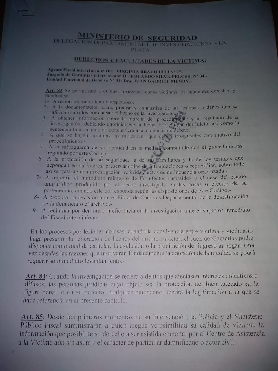 "El 24 de septiembre hice la denuncia, pero la policía lo soltó en 137 y 66, mientras yo estaba a tres cuadras haciendo la denuncia. La verdad que no sé por qué lo sueltan; la policía lo dejó y le dijeron que no aparezca más. Ahora estoy a la espera de que la fiscal pueda leer el caso y pida la captura", agregó indignada.