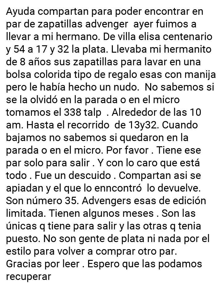 "Eran sus zapatillas Avengers talle 3. Doy recompensa. En estos tiempos es muy difícil volver a comprar otro par de zapatillas. Encima tenían poco uso, estaban en la bolsa porque las llevaba a lavar. Si el que lo encontró se apiada y las devuelve, o si ven que las venden, avisen. Tienen un abrojo arriba y cordones", escribió la mujer.