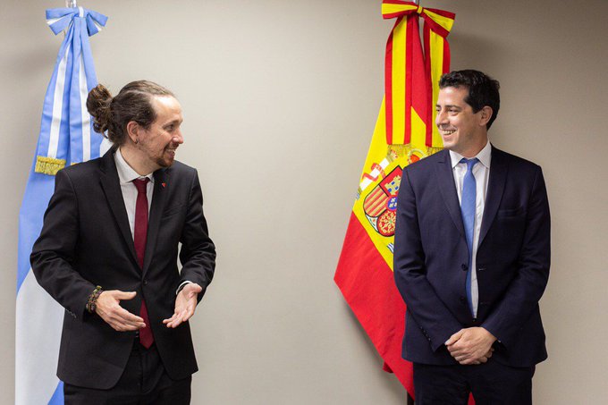 El Presidente concluyó en la noche del sábado la primera jornada de su viaje a Bolivia con un encuentro bilateral con el vicepresidente de España, Pablo Iglesias, con quien compartió una cena, en la cual estuvo acompañado por el ministro del Interior, Eduardo "Wado" de Pedro, según consignaron fuentes oficiales.