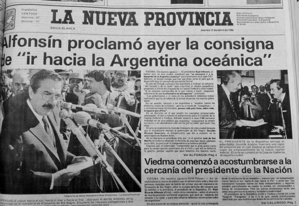 Recordó que el ex presidente Raúl Alfonsín propuso trasladar la capital a Viedma, cuyo objetivo era "descentralizar y desburocratizar el poder político, económico y financiero que residía en la ciudad de Buenos Aires, pero no se pudo concretar".