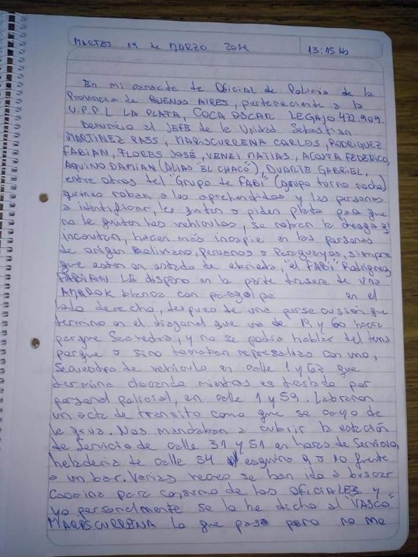 Y para terminar de creer en la responsabilidad que estos efectivos tuvieron en el hecho, la familia de Costilla vivieron dos momentos totalmente increíbles que sólo logró reforzar más la idea de que estos tres efectivos tuvieron responsabilidad en la muerte de Lito. Primero, cuando llegó a sus manos y ahora, de LAPLATA1.com, una carta de un efectivo quién terminó con su vida el año pasado, y luego, una conversación con el jefe de estos policías.