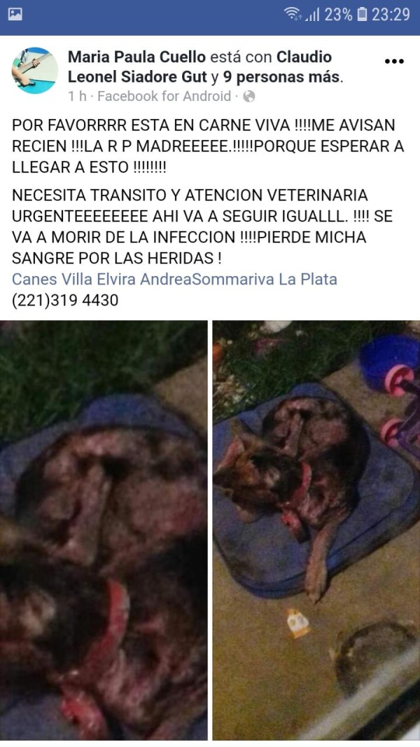 Durante este lunes se encargó de hacer visible a más no poder el caos de Mora, "una cachorra que debe tener 6 meses, es de una familia súper humilde de un barrio de Tolosa. Se comunicaron conmigo hace alrededor de un mes por otro perro que tienen que se llama Tyson, un perro que se había quedado atrapado en una reja y tuvo una lesión y sin caminar muchos días", le contó a LAPLATA1.com.