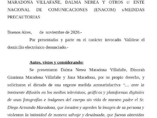 La solicitud original para que se detenga la difusión de las imágenes fue presentada por las hijas de Diego con el patrocinio de su abogado Fernando Burlando “ante la inminente difusión […] de unas fotografías e imágenes del cuerpo de nuestro padre el señor Diego Armando Maradona, que invaden y agreden la imagen de su persona y violentan la intimidad de manera salvaje y desalmada, que fueron obtenidas contrariando la expresa voluntad de sus seres queridos”.