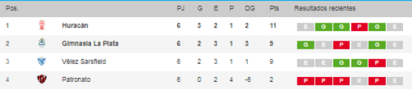 Huracán quedó primero con 11 puntos, seguido de Huracán y Vélez, ambos con nueve. Sin embargo, el Globo terminó segundo por tener mejor diferencia de gol (+3 contra +1 del Fortín). Patronato cerró las posiciones con dos unidades.