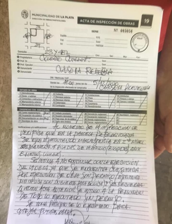 Los vecinos dieron nuevamente aviso al municipio y procedieron a detener las tareas. Además, desde la Dirección de Obras Particulares dieron la orden de remover la estructura metálica montada en el primer piso. La institución está ubicada en 487 y 23.
